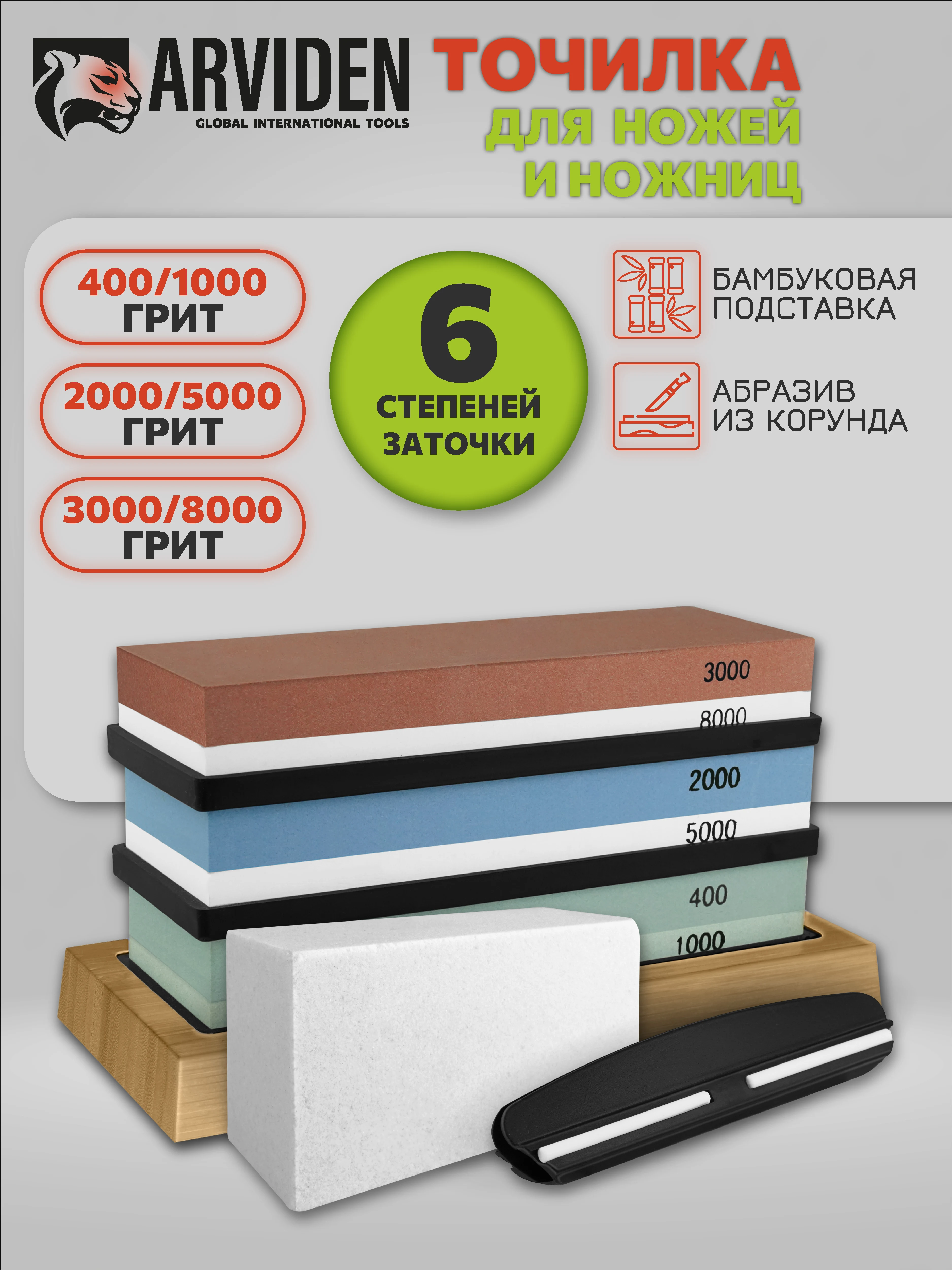 Точилка для ножей и ножниц ARVIDEN – профессиональный набор для идеальной заточки Верни бритвенную остроту своим ножам и ножницам с помощью универсальной точилки ARVIDEN. Это полный комплект для домашнего и профессионального использования, созданный для долговечной и аккуратной заточки. ✅ 6 степеней заточки – три двусторонних точильных камня с разной зернистостью (400/1000, 2000/5000, 3000/8000) подходят для грубой, промежуточной и финишной доводки. ✅ Абразив из корунда – прочный и износостойкий материал для идеального результата. ✅ Бамбуковая подставка с антискользящей силиконовой подложкой – устойчивость и комфорт при работе. ✅ Фиксатор лезвия – помогает держать правильный угол заточки даже новичкам. ✅ Корректирующий камень в комплекте – для выравнивания поверхности точильных камней. Для чего подходит: • кухонные ножи • ножницы • охотничьи и туристические ножи • инструменты (стамески, секаторы и др.) Комплектация: • 3 точильных камня (двусторонние: 400/1000, 2000/5000, 3000/8000) • 1 корректирующий камень • 1 фиксатор лезвия • 3 силиконовые подложки • 1 бамбуковая подставка Преимущества: • Подходит для начинающих и профессионалов • Универсальное решение «всё в одном» • Долговечные материалы • Удобство и безопасность в использовании
